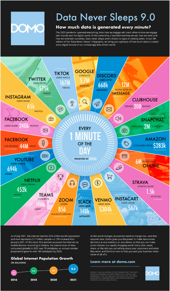 De acuerdo con el informe Data never Sleeps, elaborado por Domo, cada día se crean en Internet más de 2,5 billones de bytes de datos, y se estima que cada persona en la Tierra genera 1,7MB de datos por segundo. Somos 7.75 billones.